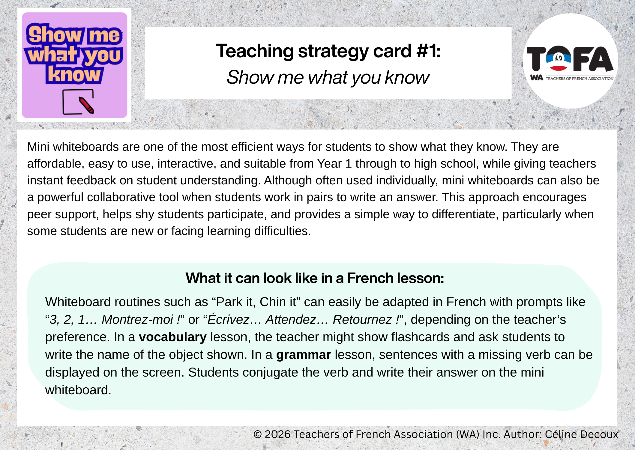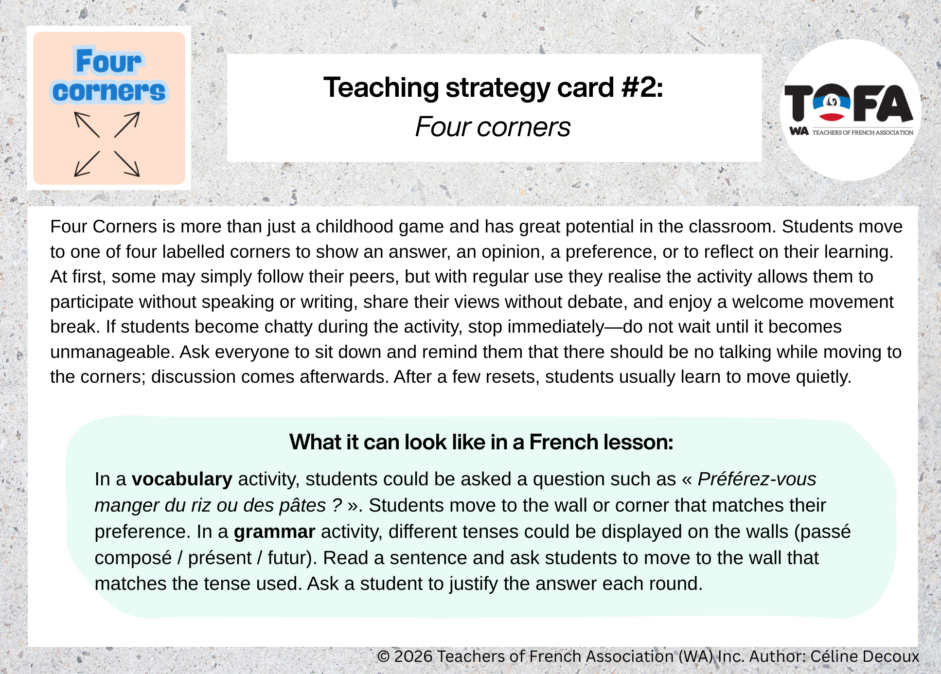 Rather than offering complete lesson plans, it generates ideas that encourage active learning, student engagement, and meaningful oral interaction in French.